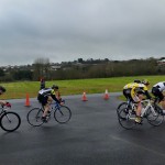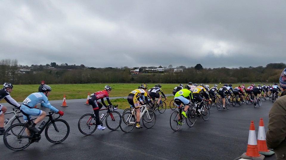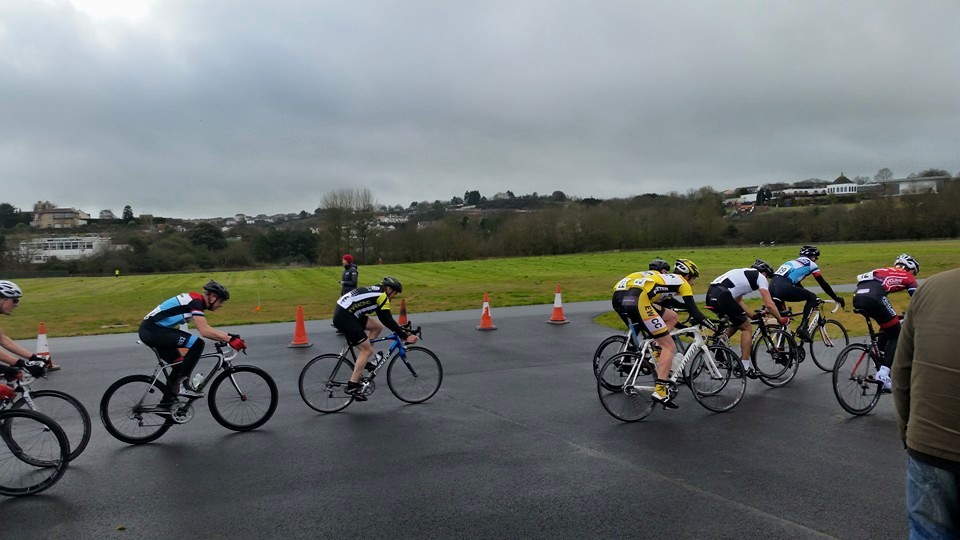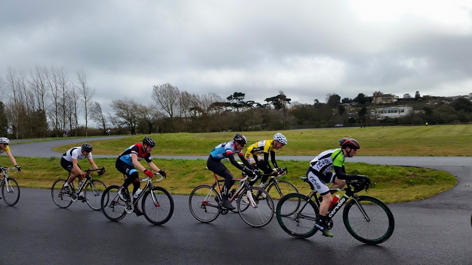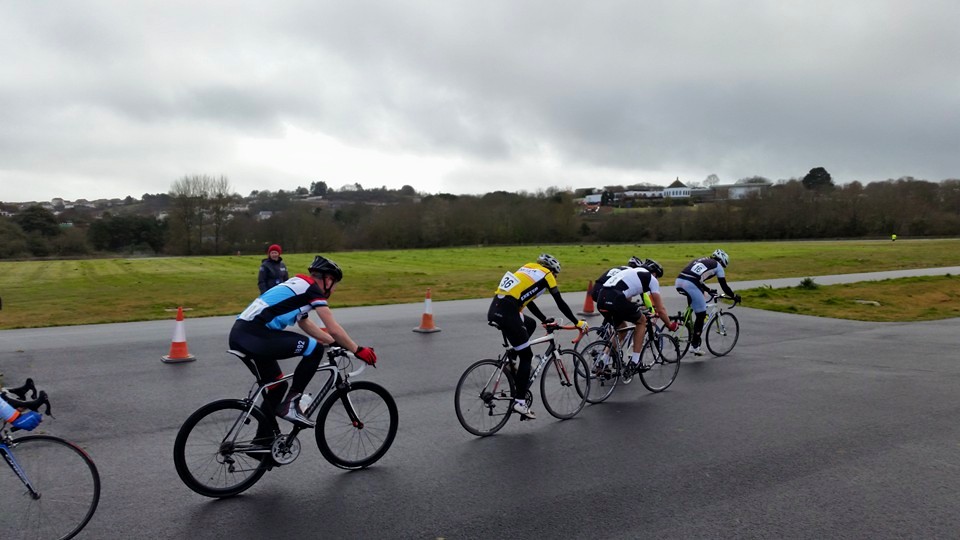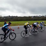 Report by Simon Bevans…Robert Cartlidge, Phil Bray and myself raced in the Cat 3/4 event at the Torbay Velo Park. As you can imagine the track was very wet, but the rain held off for about the first thirty minutes so not too grim. The race started with near on a full field of sixty riders. I dropped off the back after three laps, pulling out of the race after a further two or three laps. Rob held his own really well in the middle of the bunch for approx 10-12 laps (I think) until an easy mistake to make on his part caused him to drop off the back of the bunch. A crash occurred on a corner and the marshal waved a red flag. Rob mistakenly thought this signalled stop, but the rest of the bunch carried on. Unlucky Rob. We are always learning each time we race. You looked strong today. As for Phil, he continued his form from the later part of last year holding his own in the front five riders throughout the race and finished with a sprint for 3rd out of the main bunch on the last 200m. Well done guys.
